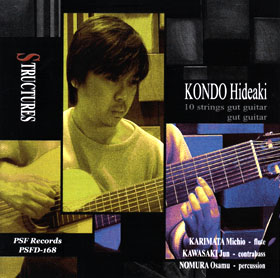近藤秀秋 / STRUCTURES PSF Records, PSFD-168, 2007 近藤秀秋(10st. gut guitar, gut guitar), 狩俣道夫(fl), 河崎純(cb), 野村おさむ(perc) 10弦のガットギターを弾く近藤の演奏は,エグベルト・ジスモンチのように,端正で,正確無比でありながら,同時にカラフルで,ダンサブルな輝きを放っ ている。(中略)現代音楽のようにも,古典的なギター曲のようにも響くガット・サウンドの不思議な浮遊感覚は,あらゆるギター・ジャンルに精通している近 藤の苦心のたまものだろう。決して多くを語らない彼の創造の秘密は,即興音楽を含む複数のジャンルの狭間で,どうバランスをとって安定するのか,またそのバランス感覚を,どうしたら演奏にまで持っていけるのか,ということではなかったかと思う。演奏のドライヴ感は,スウィング感に支配されたジャズ的なもの を捨て,より加速力のあるスパニッシュ・ギターの即興性に置き換えられている。まるで世界中の音楽から雑多な部分品をかき集め,時間をかけて精緻に組みあげられた音楽機械のように,それは万能であり,同時に怪物的である。(北里義之、「web 音場録」、2007.9.17号) |